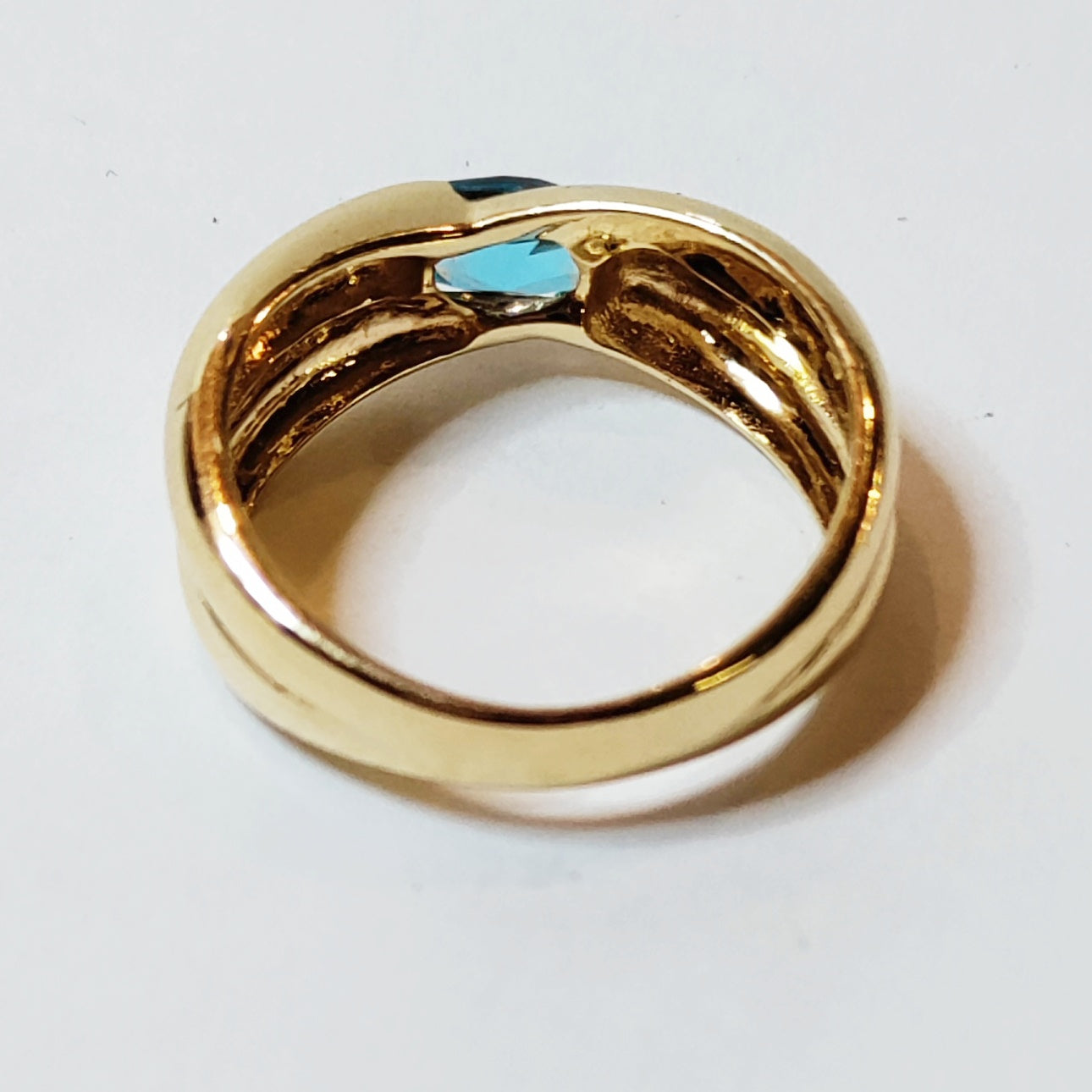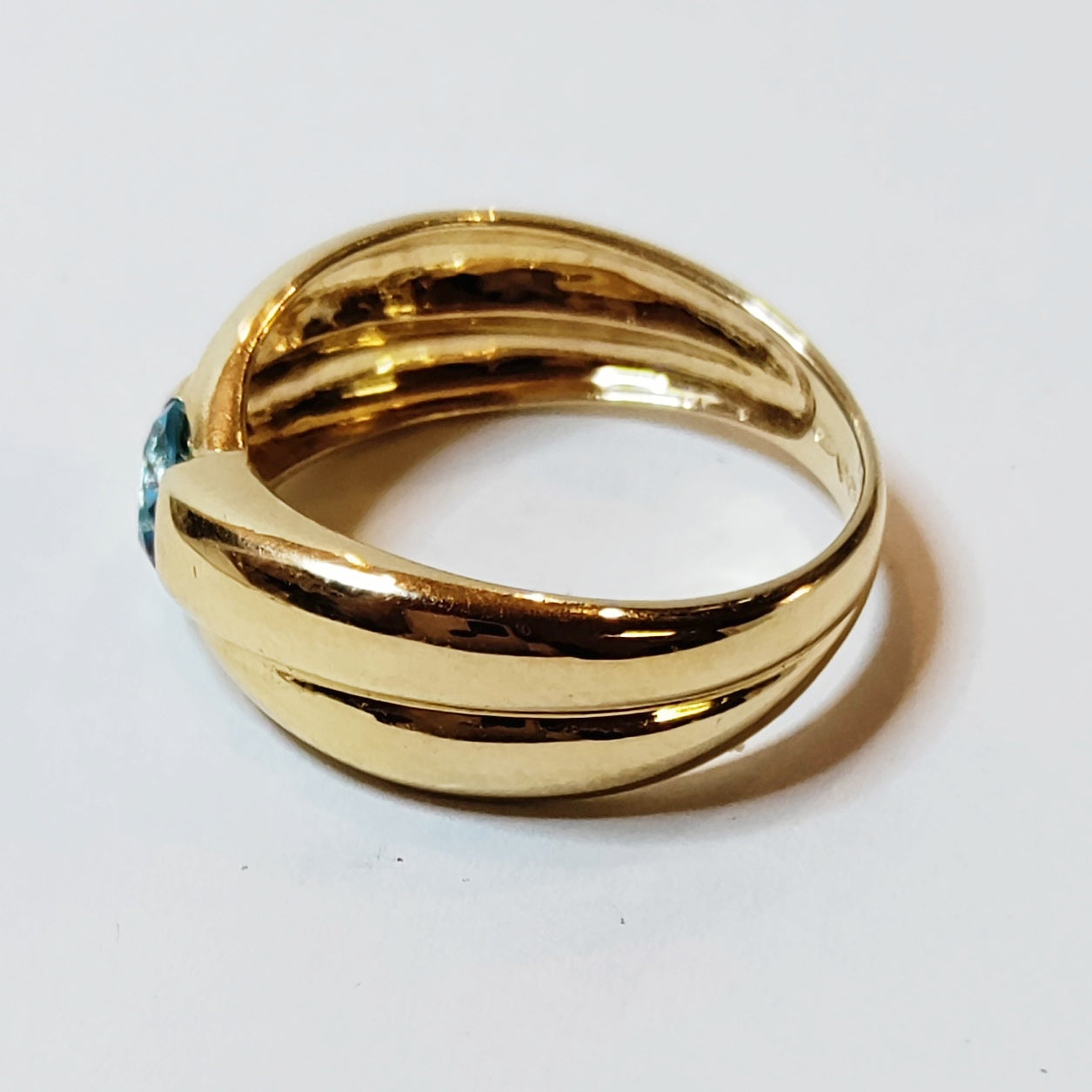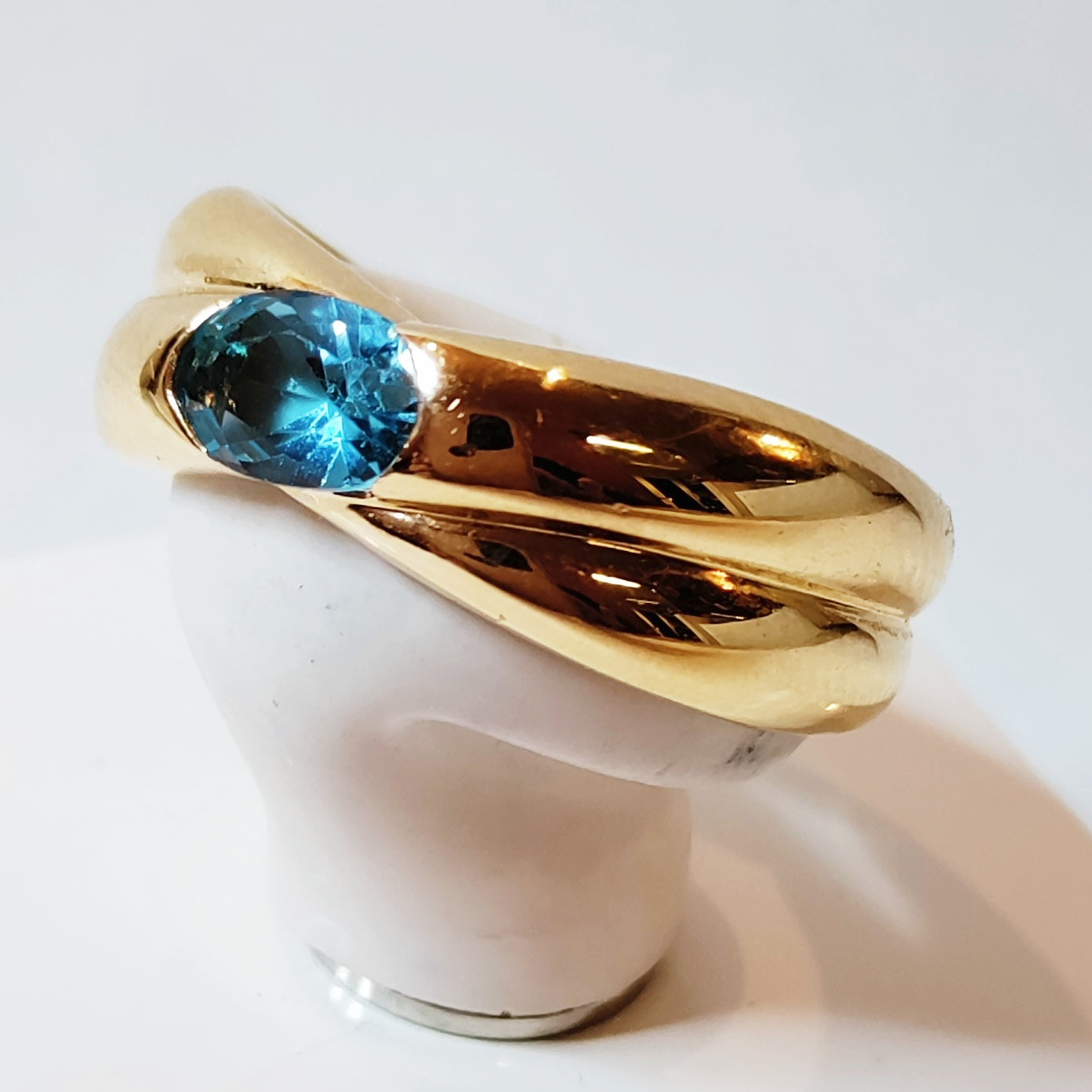 Kotimainen kultasormus vuodelta 2000 sinisellä kivellä.