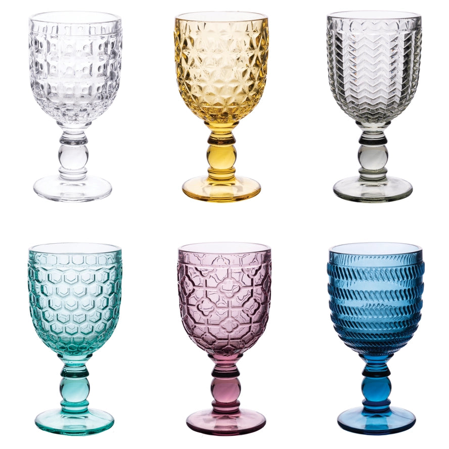 Jalallinen juomalasi geometrisilla koristeilla 6 värivaihtoehtoa: meripihka, savu, sininen, lila, turkoosi, kirkas.