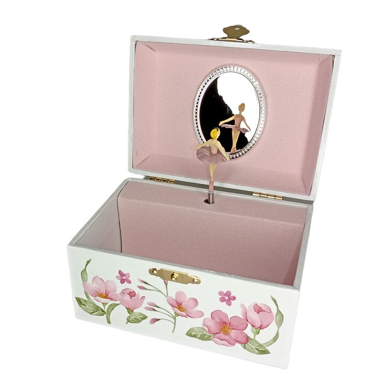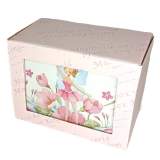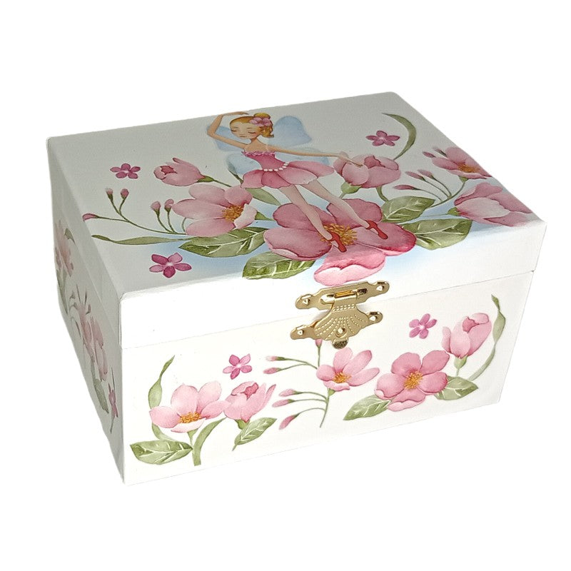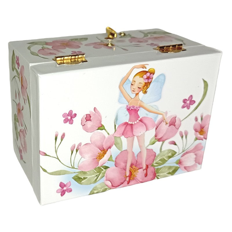 Suloinen soittorasia, jossa päällyskuviointina on keiju kukkasten keskellä. Sisäpinnoiltaan rasia on päällystetty pinkillä tekstiilillä. Kannen sisäpinnalla on lisäksi 7 cm korkea ovaali peili, jonka edessä ballerina tanssii musiikin soidessa.