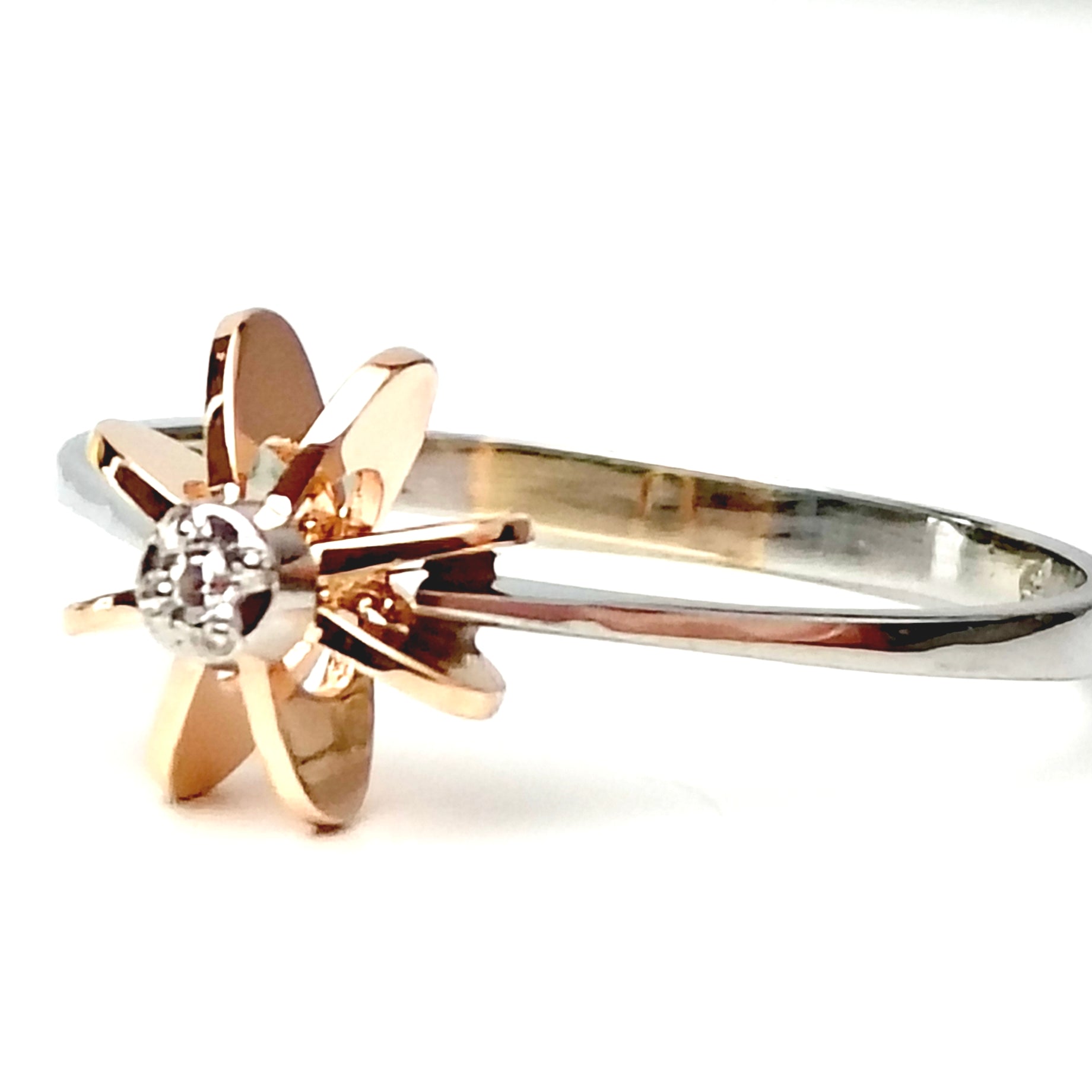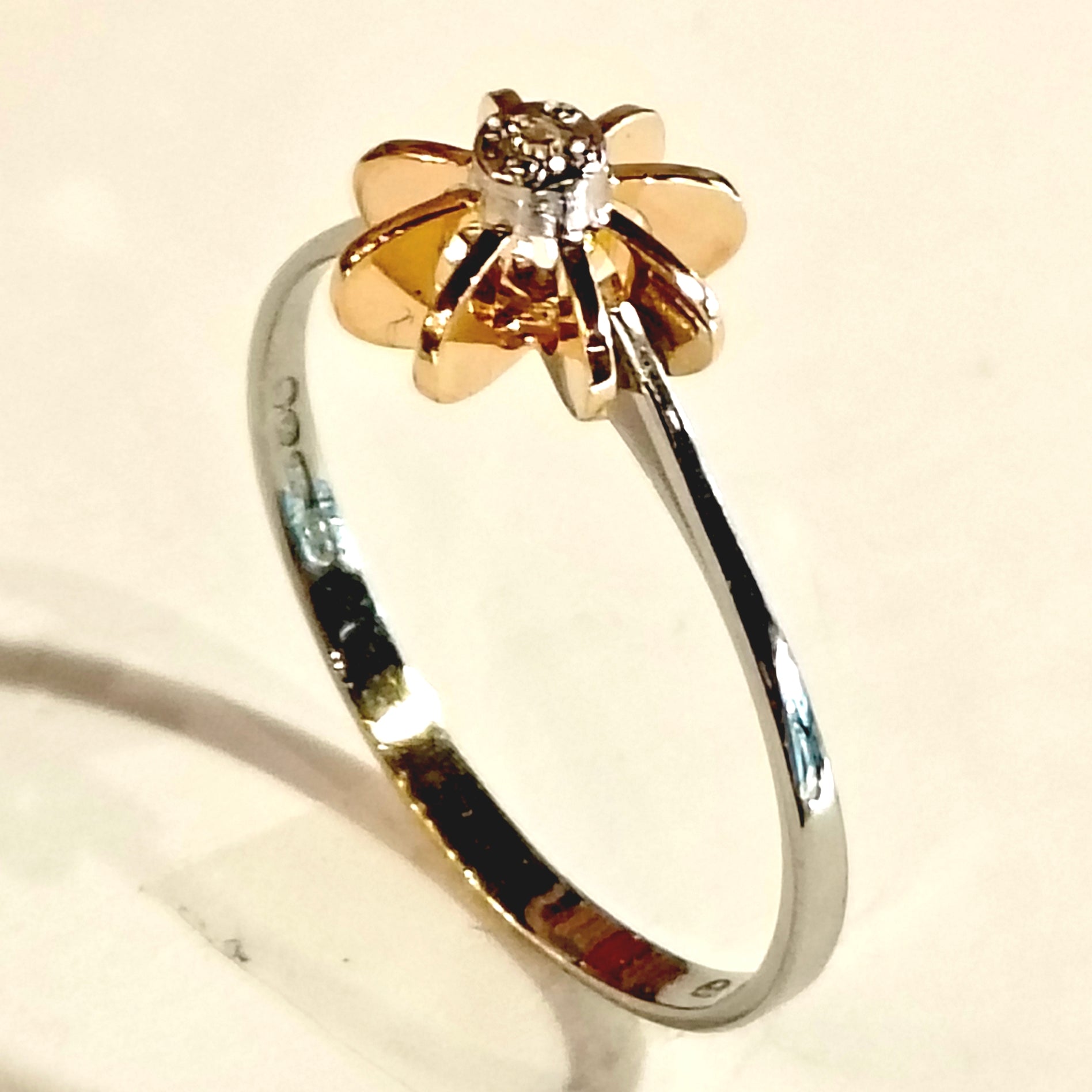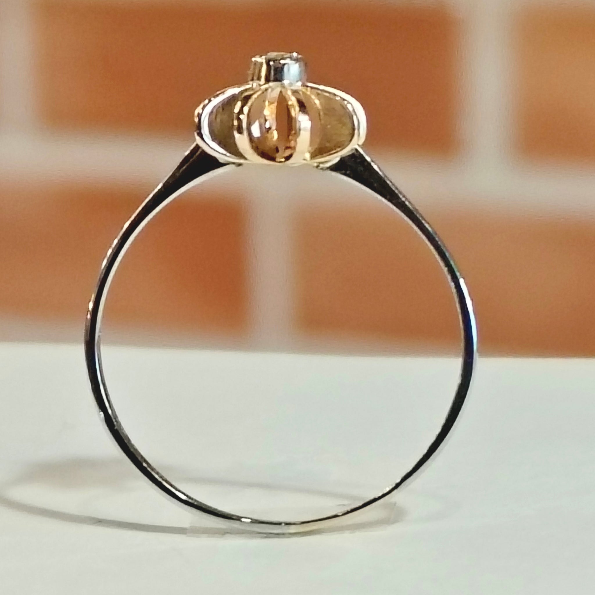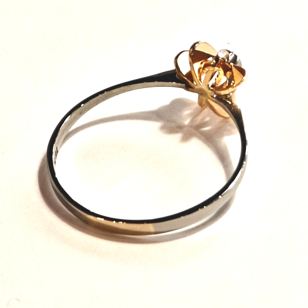 Kaunis kultasormus 750 / 18k, valkokultainen runko ja keltakultainen koristeosa kirkkaalla kivellä