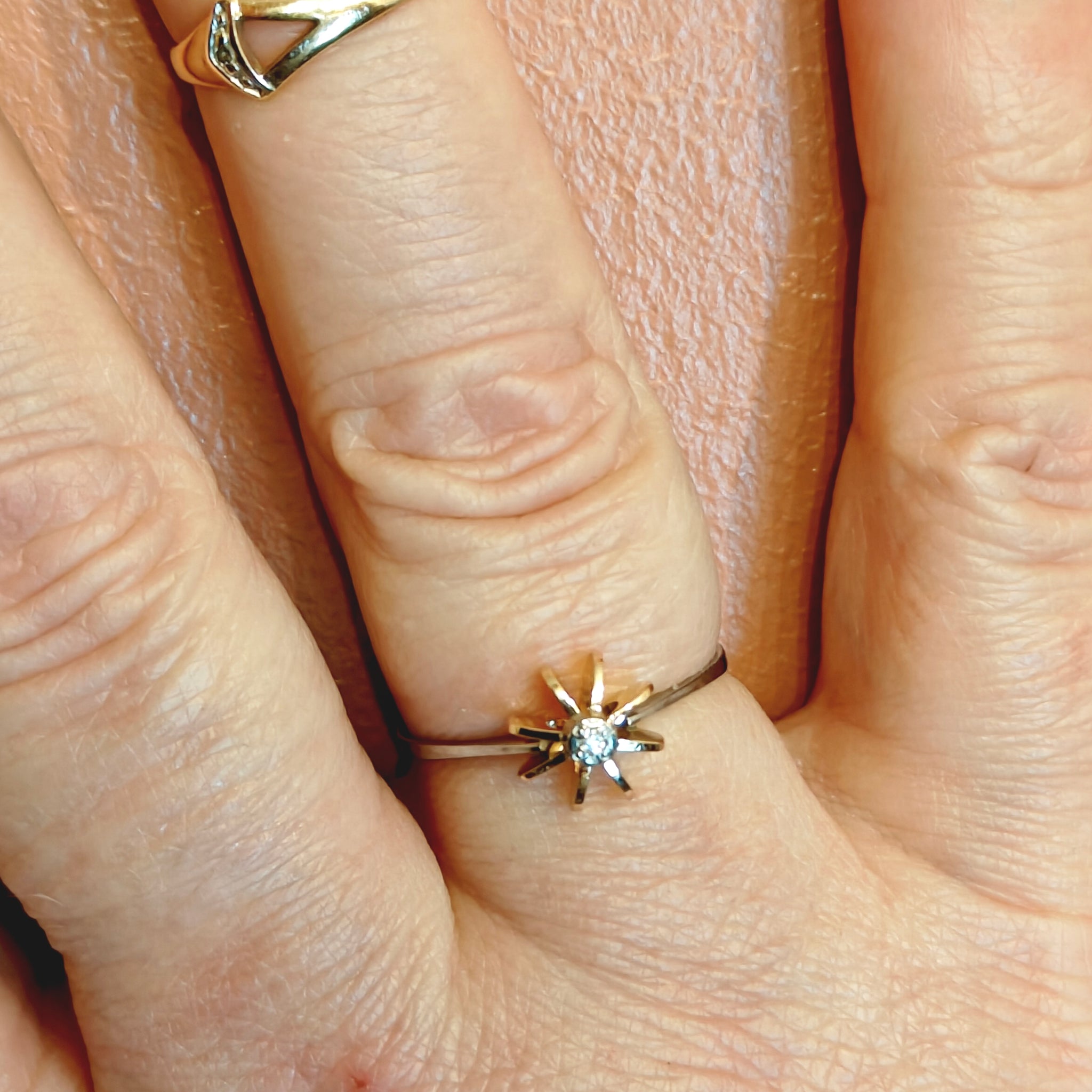 Sormukselle tehty jolloinkin koon muutos keltakullalla, näkyy kuvissa. Ei näy sormessa.