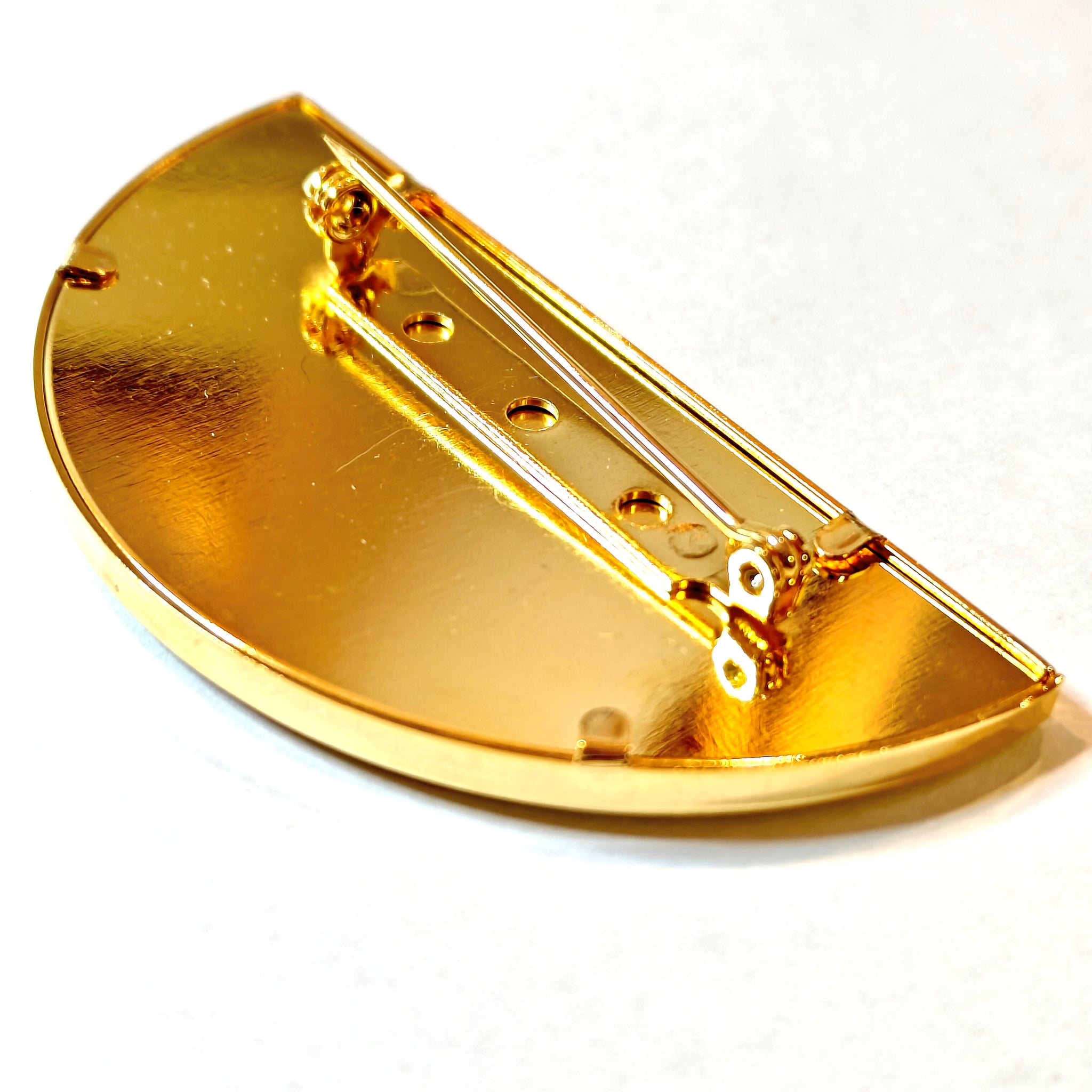 Puolikuun muotoinen käsinmaalattu rintakoru kullansävyisellä pohjalla.