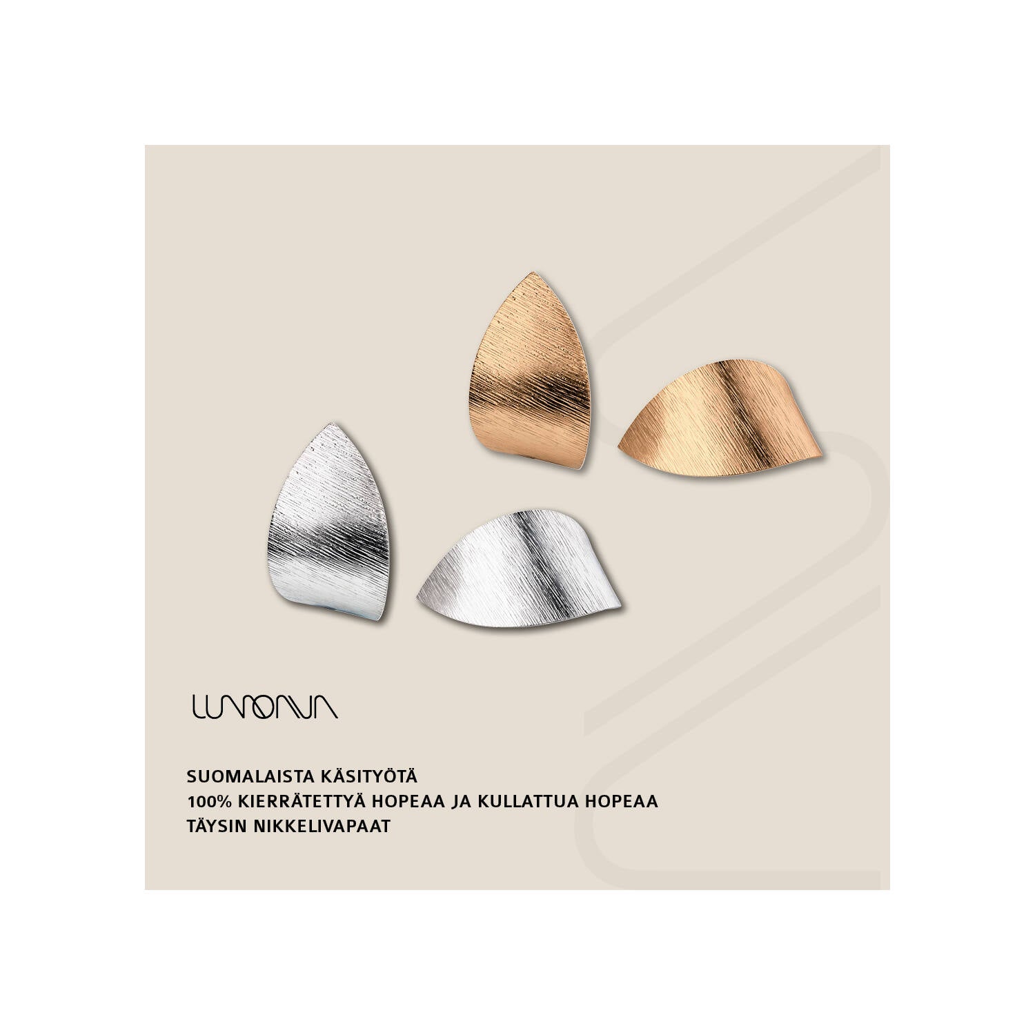 Maininki sarjan korvakoru on näyttävä katseenvangitsija, joka ilmentää erityisen hienolla tavalla aaltoon taipunutta muotoa ja veden pinnan kimaltelua. Tappikiinnityksellä toimiva korvakoru on Lumoavan tapaan erittäin miellyttävä ja kevyt käyttää. Saatavilla myös keltakullattuna.